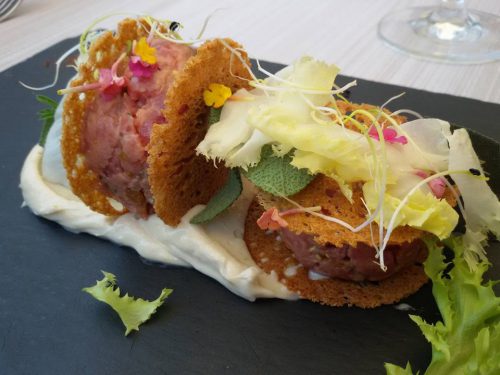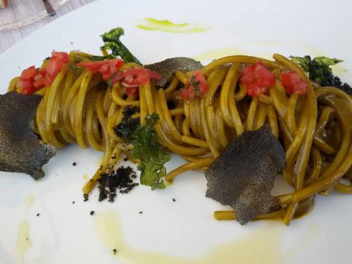 Ancora un classico La Tartare di vitello irpino con fichi e nocciole, da tempo stabilmente in carta, dal sapore terragno e voluttuoso. Qui, autentico e verace viene fuori alla grande il Vigna Astroni 2014 di Cantine Astroni, il bianco vulcanico di Gerardo¤ bevuto, si può dire, tutto d’un fiato: avvenente e calibrato al naso, così ampio e varietale, regala sorsi di freschezza e ritagli minerali assai piacevoli. Vino saporito e solare.