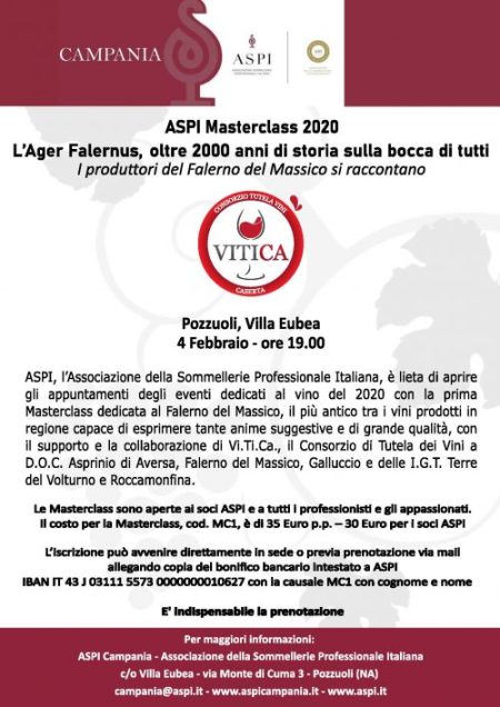 ASPI, l’Associazione della Sommellerie Professionale Italiana, l’unica associazione italiana riconosciuta dall’ASI (Association de la Sommellerie Internationale), è lieta di aprire gli appuntamenti degli eventi dedicati al vino del 2020 con la prima Master class dedicata al Falerno del Massico, il più antico tra i vini prodotti in regione capace di esprimere tante anime suggestive e di grande qualità, con il supporto e la collaborazione di Vi.Ti.Ca., il Consorzio di Tutela dei Vini a D.O.C. Asprinio di Aversa, Falerno del Massico e Galluccio delle I.G.T. Terre del Volturno e Roccamonfina, costituito il 4 maggio 2004 è primo consorzio di tutela dei vini riconosciuto in Campania dal Ministero delle politiche agricole, alimentari e forestali con DM del 18/01/05.