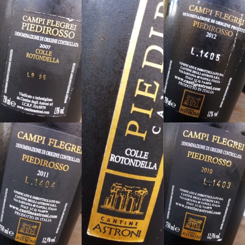 ** Piedirosso Campi Flegrei Colle Rotondella 2012. L’ultima vestita di nero, con etichette trendy per l’epoca, un nuovo taglio scelto qualche anno prima per provare a far prendere il largo dalla casa madre quei vini provenienti dalle vigne di proprietà, proprio come il Colle Rotondella. Il colore è marcato da un tono scuro, granato con note aranciate/brune sull’unghia del vino nel bicchiere. Il naso è terragno, conserva buona pulizia olfattiva ma vi si riconoscono soprattutto note di terra bagnata, sottobosco, frutta secca più che altro, con il sorso asciutto e snello, con ancora buona intensità. ⇒12% di alcol in volume in etichetta.