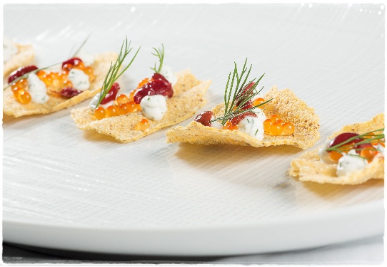 Sfoglie di Granoturco, Corniolo e Uova di Trota. Contrasto dolce-sapido sul filo di lana. Qui ritorna utile tutta la fragranza e la freschezza del Perlé Brut!