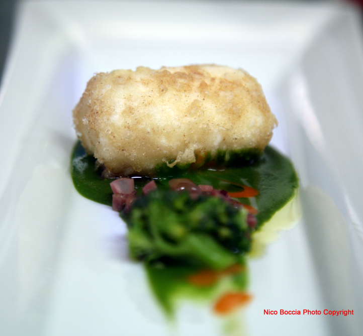 Uno dei must di Tonino Pisaniello, la ricotta di Montella fritta su passatina di broccoli e soppressa di Venticano, equilibrio e suggestione territoriale…