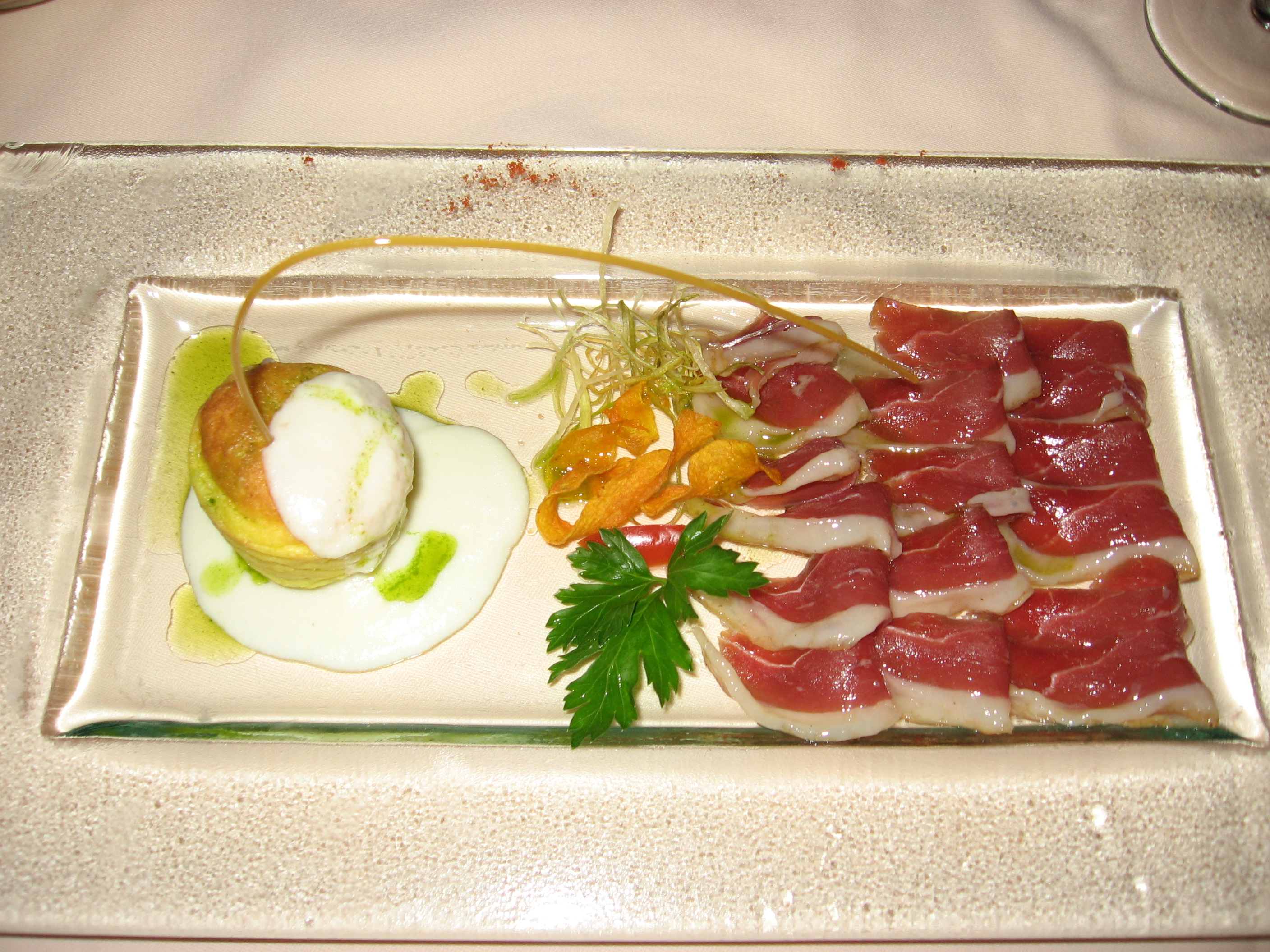 Iniziamo con un buonissimo Flan di asparagi e zucca accompagnato da prosciutto di petto d’anatra mediamente stagionato, essenza di territorio e sapori vivi.