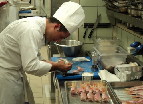 La tradizione: la manualità classica richiesta dalla cucina mediterranea, qui nella preprazione di uno dei piatti must di Andrea Migliaccio, la Triglia farcita…