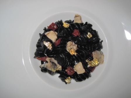 Per il servizio: Utile un bel piatto bianco che lascerà esaltare le colorazioni della preparazione: adagiare la pasta al centro del piatto, tagliare ogni ostrica a tre pezzi e riporle sulla pasta, aggiungere quindi i pomodori secchi tagliati a dadi, terminare la decorazione con brillanti foglie d’oro alimentare.