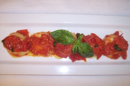 Per il servizio: disporre i ravioli (tre/quattro) in un piatto piano bianco, coprirli con la salsa di pomodori e decorare con una foglia di basilico. A richiesta con una grattugiata di parmigiano reggiano stagionato.