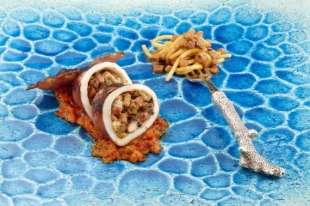 8 – Terrina di polpo, calamaretto ripieno di pancetta in salsa di pomodoro.
