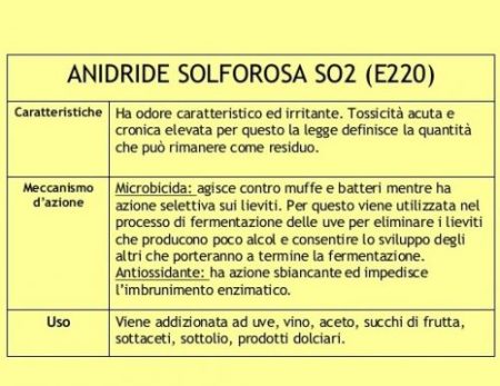 Cos’è? E’ sostanzialmente un gas incolore, dall’odore pungente e acre, viene utilizzato in enologia per le sue importanti azioni antiossidanti, conservanti e antisettiche, attività indispensabili per la qualità, salute e stabilità del vino. Ma non solo, l’SO2, questa la sua formula chimica, è di fatto uno dei più comuni conservanti utilizzati in tutta l’industria alimentare e delle bevande. Vi sono però delle regole ferree da rispettare, l’Unione Europea infatti ne identifica e codifica il suo utilizzo con delle sigle numeriche precise precedute dalla lettera “E” che devono essere opportunamente riportate nell’elenco degli ingredienti. Tra queste, quelle sigle comprese fra E220 ed E229 sono classificate come “solfuri” – esempio l’anidride solforosa (E220) e il metabisolfito di potassio (E224) – con proprietà conservanti, antisettiche e antiossidanti, evidenza necessaria perché queste sostanze possono provocare eventuali reazioni allergiche in quelle persone sensibili e/o predisposte.