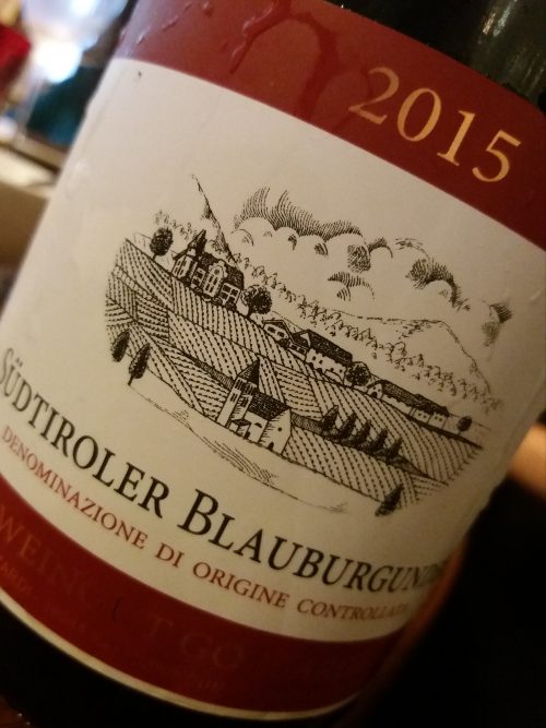 Il Blauburgunder duemilaquindici ha uno splendido colore rosso rubino trasparente, più ”leggero” sull’unghia del vino nel bicchiere. Al naso è inizialmente scontroso, chiuso, ha necessità del suo tempo per aprirsi, rivelarsi, un po’ come entrare in una stanza lasciata chiusa per qualche periodo che richiede un po’ di tempo per riconsegnarci la sua memoria; ne viene poi fuori, infatti, un quadro olfattivo molto interessante, arrivano sentori di lamponi, amarene ma anche note di sottobosco, spezie fini e pietra focaia. Il sorso è avvincente e pieno, vigoroso e ben tessuto, fresco e appena tannico, di raro equilibrio gustativo nonostante il 14% di alcol in volume in etichetta. E’ senz’altro uno dei migliori assaggi dell’anno!
