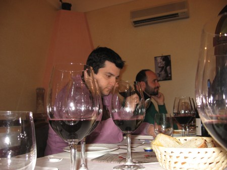Colli di Salerno rosso Borgo di Gete 2006 Il colore è senza soluzione di continuità, rubino netto, bello vivo, il vino è concentrato e scorre nel bicchiere con una precisa densità. Il naso è estremamente pulito, in prima battuta non si offre particolarmente complesso, ma la bellezza del tintore, carpita dagli assaggi comparati di oggi, sembra essere proprio quella di celare il proprio ventaglio olfattivo a chi non lo sa aspettare. Dapprima fruttato, polposo, sentori di piccoli frutti rossi e neri, mora, susina, poi di nuovo l’elegante speziato, più fine del precedente, sottile e persistente, che lascia di volta in volta il primo piano anche a frutta secca e sentori balsamici. In bocca è intenso, un vino deciso, strutturato, maturo, estremamente godibile; Il tannino pare risoluto, il nerbo acido è alla mercè della carica glicerica e se ne giova la beva, un vino ossuto ma voluttuoso, una vera goduria di vista, olfatto, gusto. Sul piccione, trovandone a proprio piacimento la variazione sul tema!