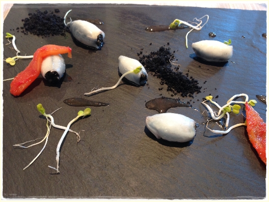 Altro giro altre sensazioni. Molto buono lo Sgombro arrosto,  gazpacho e grano spezzato (1), con la vellutata delicatezza del gazpacho che inchioda le velleità dello sgombro; sapori netti invece con il Vitello Stonnato, già un must qui a Sud, ovvero lingua di vitello con pesce azzurro marinato alla shiso, maionese al pomodoro e polvere di capperi (2).
